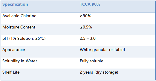 Trichloroisocyanuric acid (TCCA) is a white crystalline powder or tablet with a strong chlorine odor. It contains a large amount of available chlorine (≥90%) and is widely used as a disinfectant, bactericide and bleaching agent. It dissolves slowly in water and provides a long-lasting disinfectant effect.